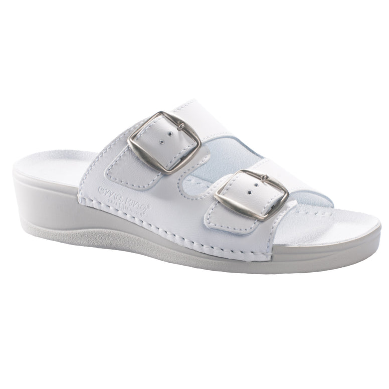 Classic slip-on heeled sandals for women, crafted from genuine leather, featuring two adjustable buckle closures. These versatile sandals are suitable as indoor shoes, work shoes, or for street wear. Made in Estonia by a family-run workshop with nearly 100 years of shoemaking experience.