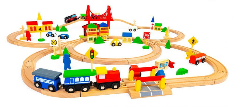 The Ecotoys train set is crafted from solid wood, offering lasting quality and hours of imaginative play. This comprehensive set includes 90 pieces:
